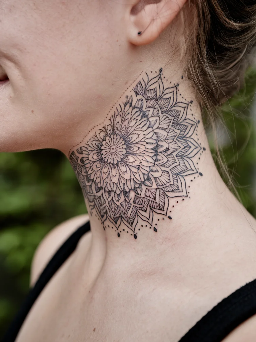 Intricate mandala neck tattoo